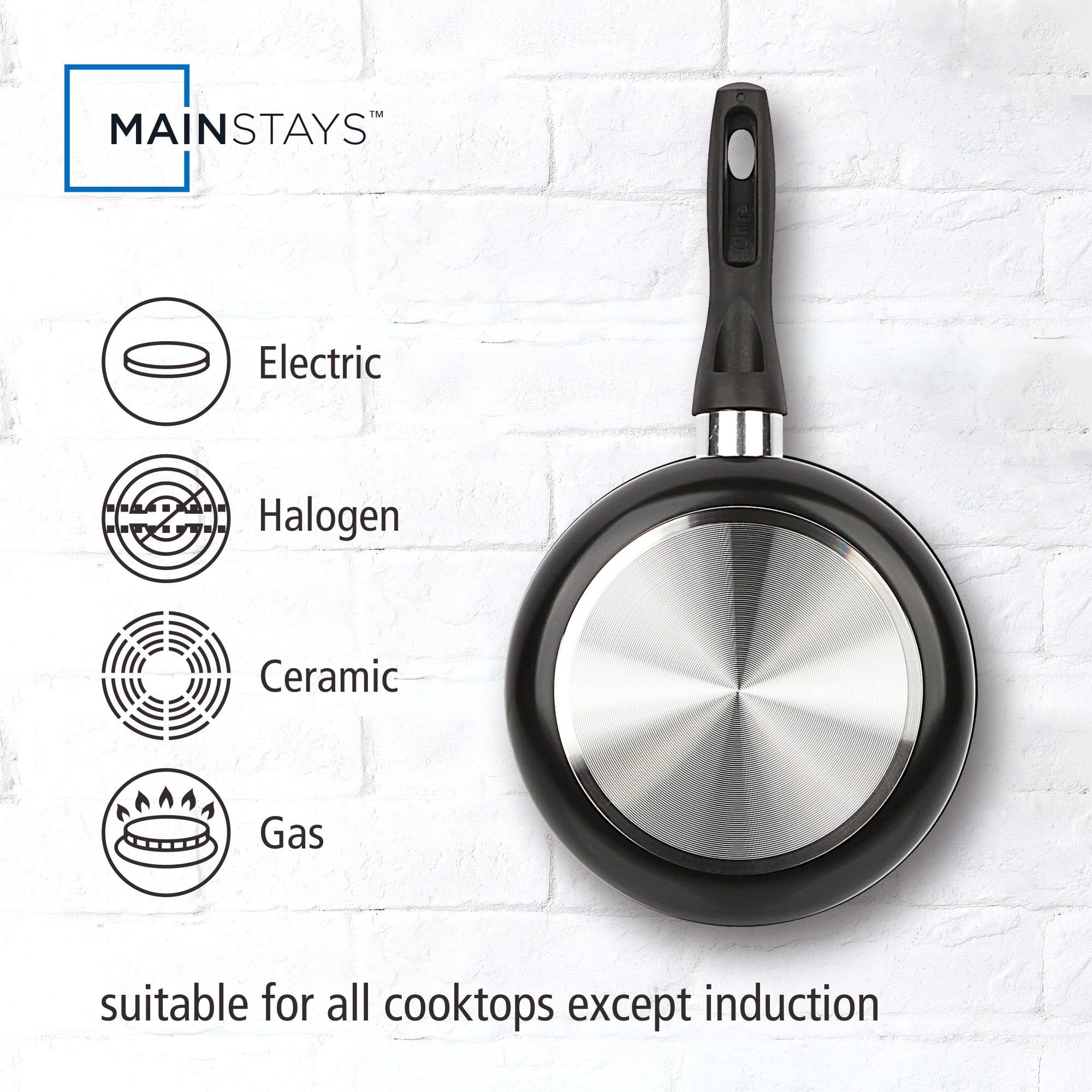Mainstays basic aluminum nonstick 2qt saucepan 18cm black.Ideal for everyday multi-use at home, the saucepan heats quickly and evenly with its aluminum body.Its interior is coated with 2 layers of non-stick coating which makes it easy cook and easy clean-up. Riveted handle for strong connection. Its cool touch handle make it easy and comfortable handling. And it's dishwasher safe. Suitable for all cooktops except induction.