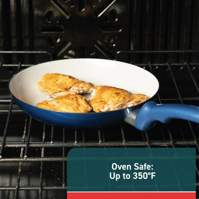 Enhance your cooking experience with the Kitchen Solutions Ceramic non-stick 14pc cookware set, designed for a thoughtful home. Enjoy healthier cooking with little to no oil and effortless release thanks to the ceramic-nonstick coating. Thermo-Spot® heat indicator shows when pans are perfectly preheated to start cooking, and the even heat base allows for no hot spots ensuring excellent results. Features comfortable handles and glass lids for better control when cooking. This set is oven safe up to 350°F and compatible with all cook tops except for induction. Hand wash only.