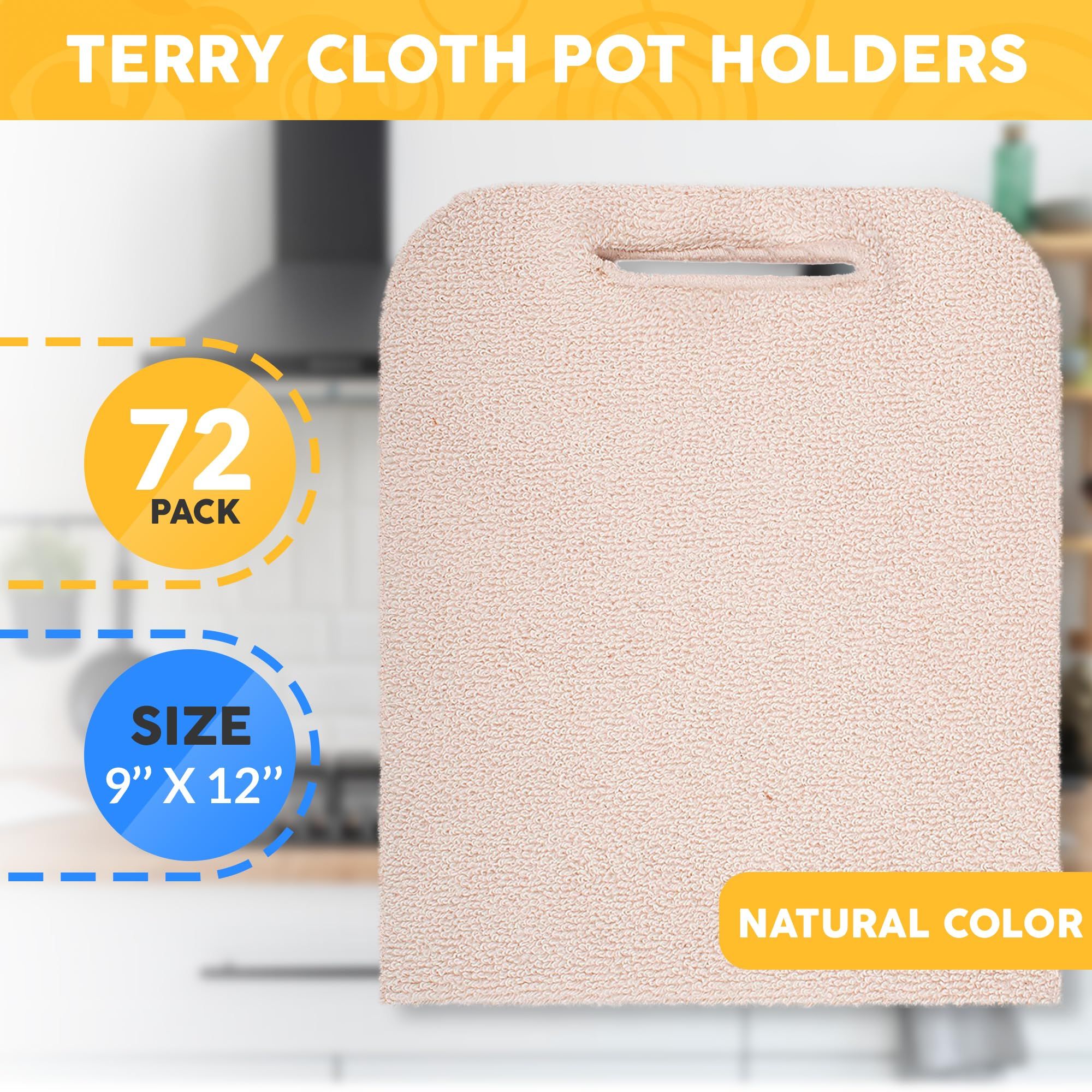 Home > Terry Cloth Pot Holders for Kitchen 9 x 12 Inch. Pack of 72 Natural Color Hot Pads for Kitchen. Washable Pot Holder with Hand Hole. Thick Cotton 460 F
