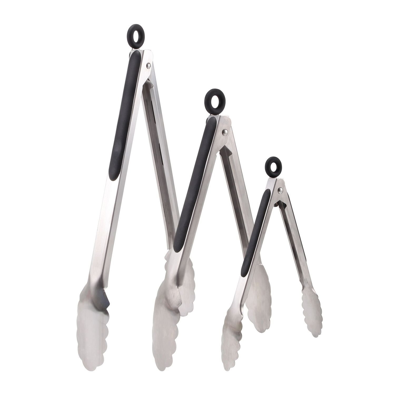 5.MULTIPLE APPLICATIONGS : The kitchen tongs set contains 3 sizes - Small 7", Medium 9", Large 12", making it perfect for basic kitchen tasks, be it used indoors or outdoors.