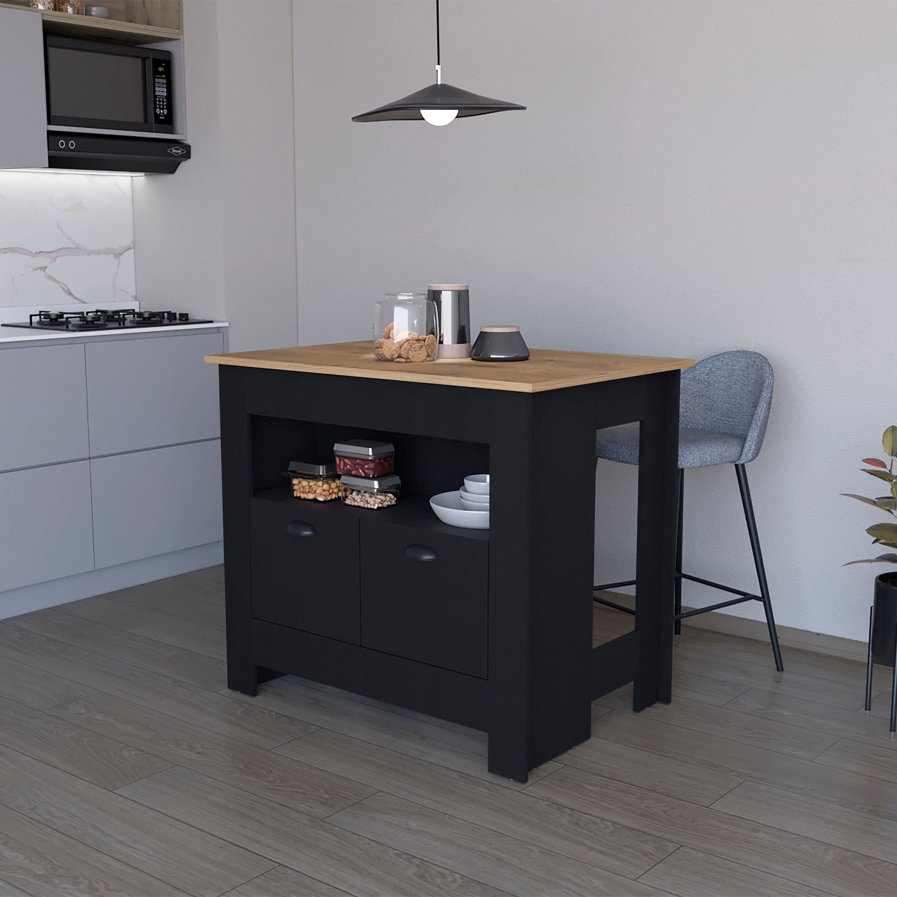 "Elevate your kitchen to a new level of elegance and functionality with our stunning kitchen island.Our kitchen island is the perfect addition to your kitchen, as it seamlessly combines style and utility in one piece of furniture. With two doors that measure 12" height and 14.9" width, this island provides ample storage space for your kitchen utensils.Inside, you'll find two shelves, each measuring 12" height, 17.1" width and 11.3" depth. These shelves are perfect for displaying your favorite kitchen accessories or decorative items. The third shelf, located at the top, offers even more space to organize your ingredients, utensils and other kitchen tools.Dimensions:Height: 35.3"Width: 40.5"Depth: 27.5"Cabinet Type: Ready to assemble (requires complete assembly).Certifications: CARB Phase II compliant - TSCA Title VI compliant.Warranty: 1 year warranty on wood parts - 1 year warranty on hardware parts from the date of manufacture shown on the lot number printed on the product box.